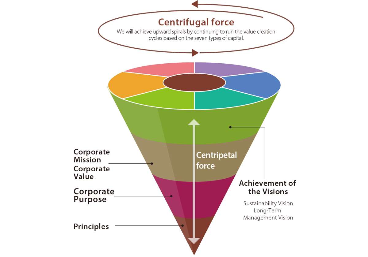 To create social value through the Tsumura Group’s products and services, we place organization capital* at the center of management, based on our philosophy. We harness this organization capital to increase centripetal force, aiming to realize our Sustainability Vision and Long-Term Management Vision as the autonomous activities of our employees accumulate to form a great centrifugal force.