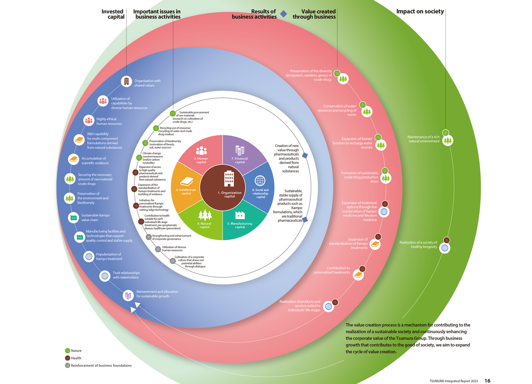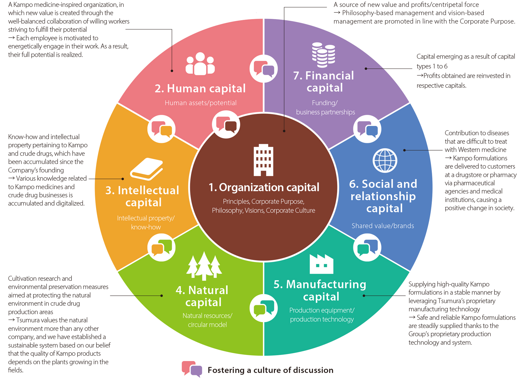 - The International Integrated Reporting Council’s “International Integrated Reporting Framework” presents six capitals as a concept for examining an organization’s approach to inherent value creation. To these, the Tsumura Group has added “organization capital” as a seventh capital. This capital is our own original concept. Just as Kampo medicines are composed of a combination of several crude drugs, we aim to create an organization that brings together many people with unique capabilities and individuality in a well-balanced state to create ourideal social value.