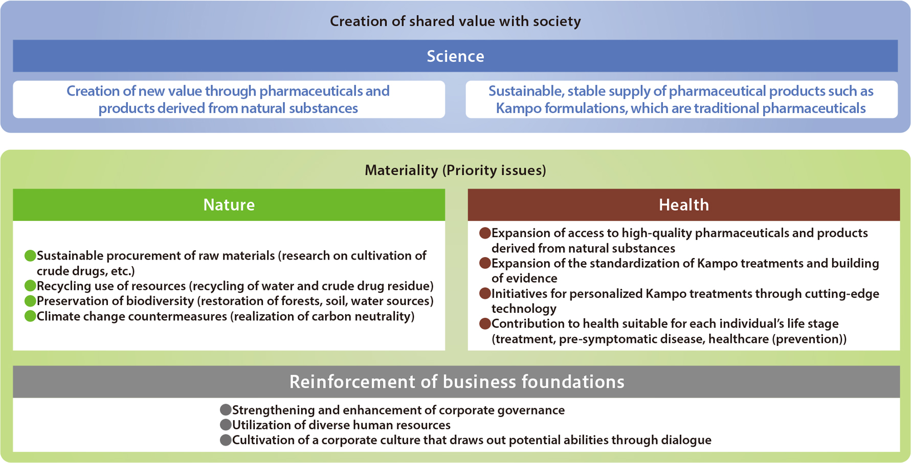 The Tsumura Group’s materiality (priority issues) refers to its initiatives for business to embody its Corporate Purpose, “Lively Living for Everyone,” and its Corporate Value, “The Best of Nature and Science.” All values related to nature and health that are created by the Tsumura Group’s business lead to the creation of shared value with society.