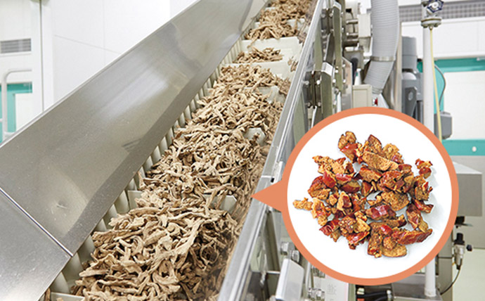 Cut materials are weighed and mixed according to the prescribed mixing ratio, and then transferred to large stainless-steel containers. The unit quantity for mixing is approximately 500 kilograms.