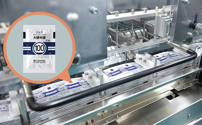 Extract granules are packaged in aluminum sachets with a machine that can at once fill 12 sachets per sheet and also simultaneously and automatically weigh each sheet.