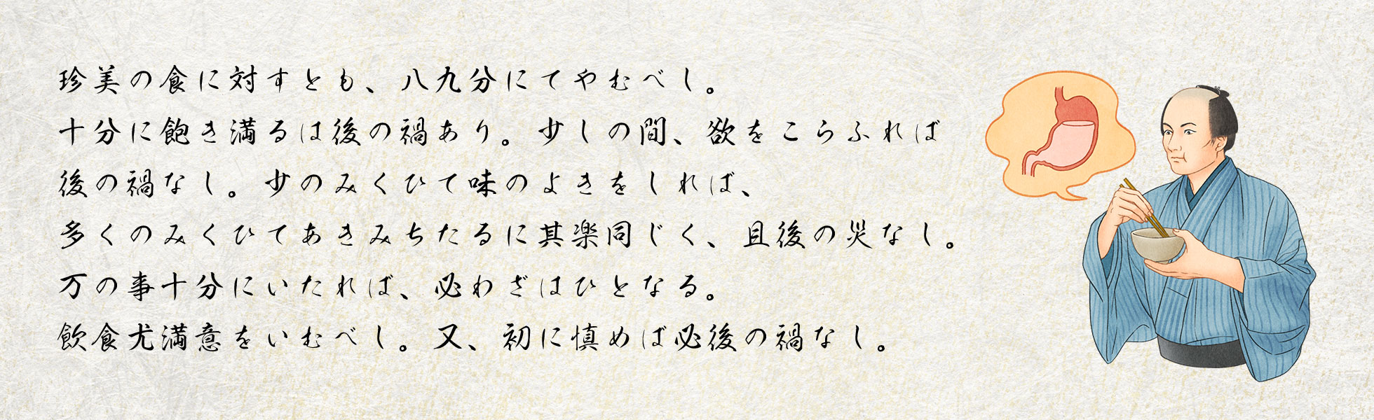 「珍美の食に対すとも、八九分にてやむべし。十分に飽き満るは後の禍あり。少しの間、欲をこらふれば後の禍なし。 少(すこし)のみくひて味のよきをしれば、多くのみくひてあきみちたるに其楽(たのしみ)同じく、 且(かつ)後の災(わざわい)なし。万(よろず)の事十分にいたれば、必(かならず)わざはひとなる。飲食尤(もっとも)満意をいむべし。又、初に慎めば必後の禍(わざわい)なし。」