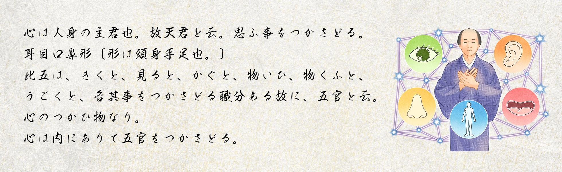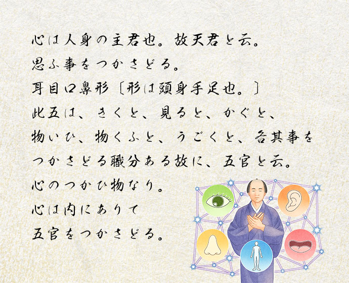 「心は人身の主君也。 故天君(ゆえにてんくん)と云(いう)。思ふ事をつかさどる。耳目口鼻形〔形は頭身手足也。〕此五は、きくと、見ると、かぐと、物いひ、物くふと、うごくと、各其(その)事をつかさどる職分ある故に、五官と云。心のつかひ物なり。心は内にありて五官をつかさどる。」