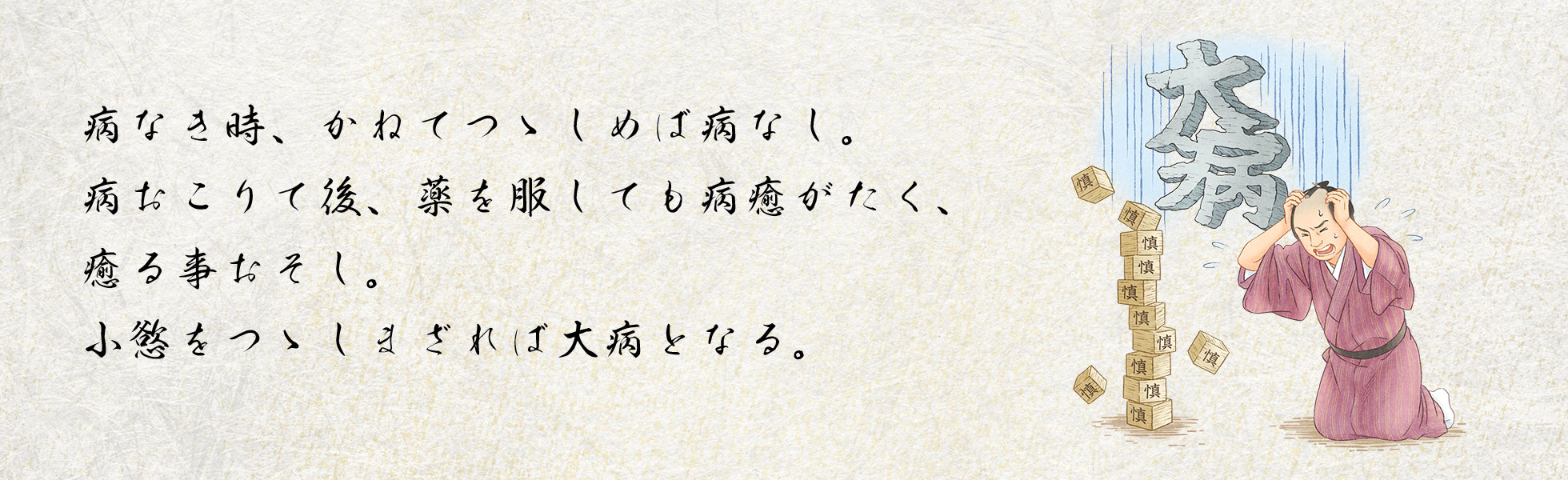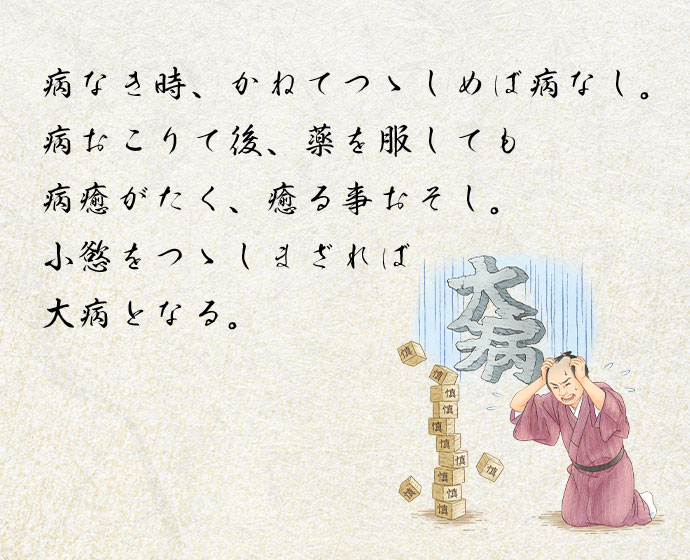 「病なき時、かねてつゝしめば病なし。病おこりて後、薬を服しても病癒(いえ)がたく、癒る事おそし。小慾をつゝしまざれば大病となる。
