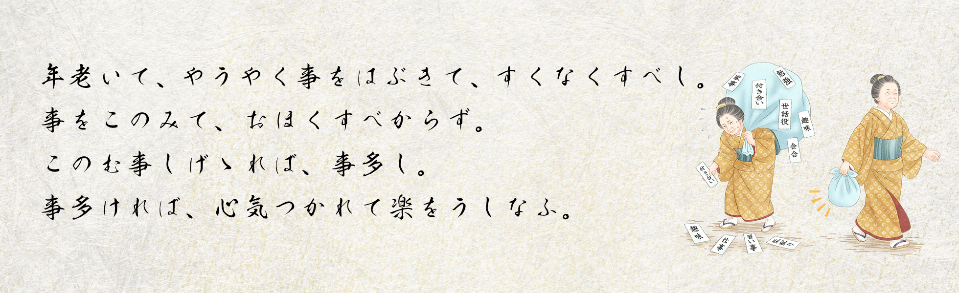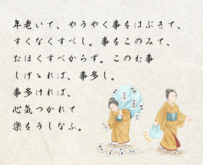「年老いて、やうやく事をはぶきて、すくなくすべし。事をこのみて、おほくすべからず。このむ事しげゝれば、事多し。事多ければ、心気つかれて楽(たのしみ)をうしなふ。」