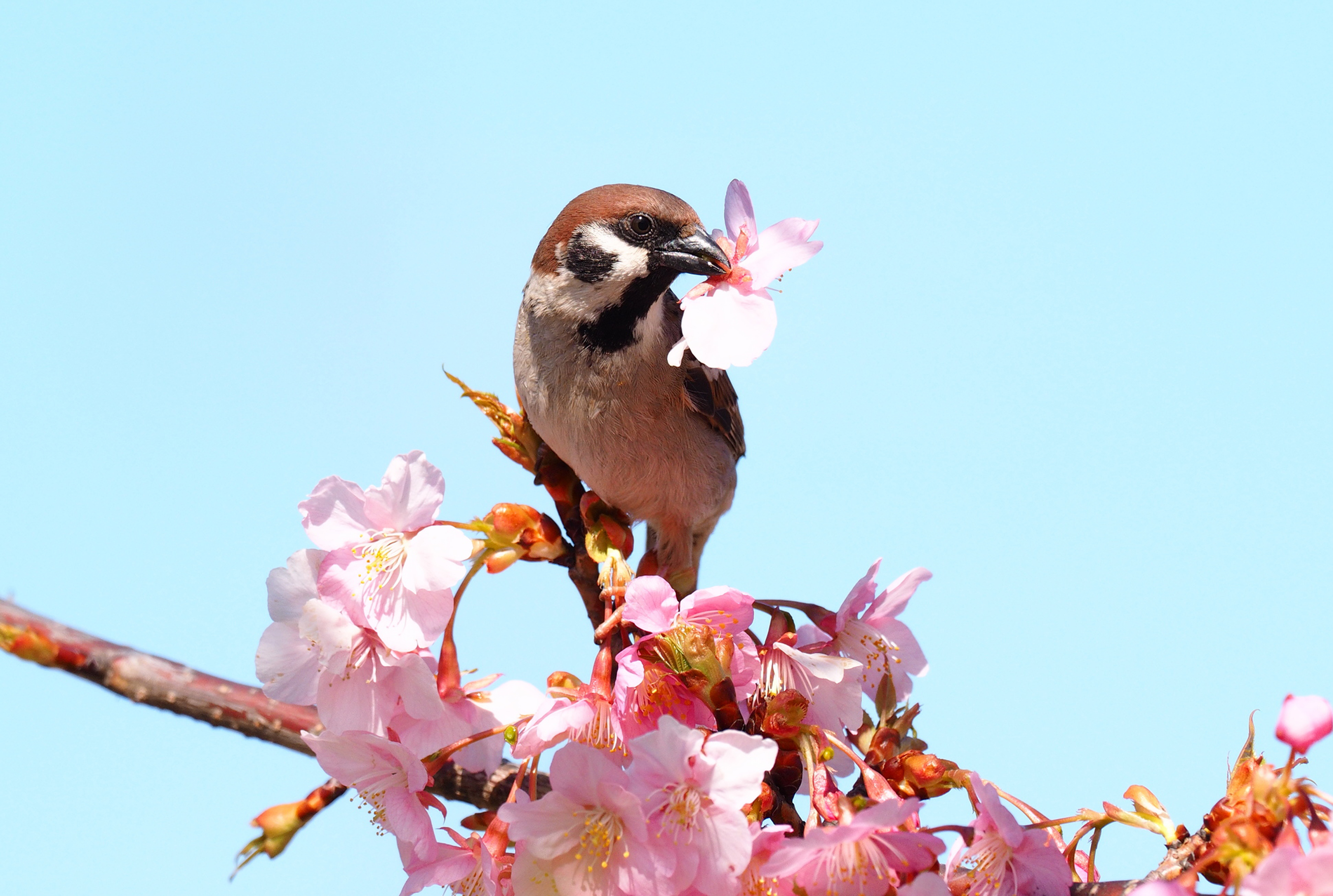 スズメは春、相手を決めると群れを離れ、協力して巣作りに励みます。スズメの巣の材料はイネ科の草。食べているのも主にイネ科の雑草の種ですが、ハコベの若葉や木の実、そして子育て中は虫をとってきてせっせと与え、じきに咲き出す桜の盗蜜も行います。スズメの抱卵は十日間ほど。孵化してからは2週間ほどで、巣立ちを迎えます。