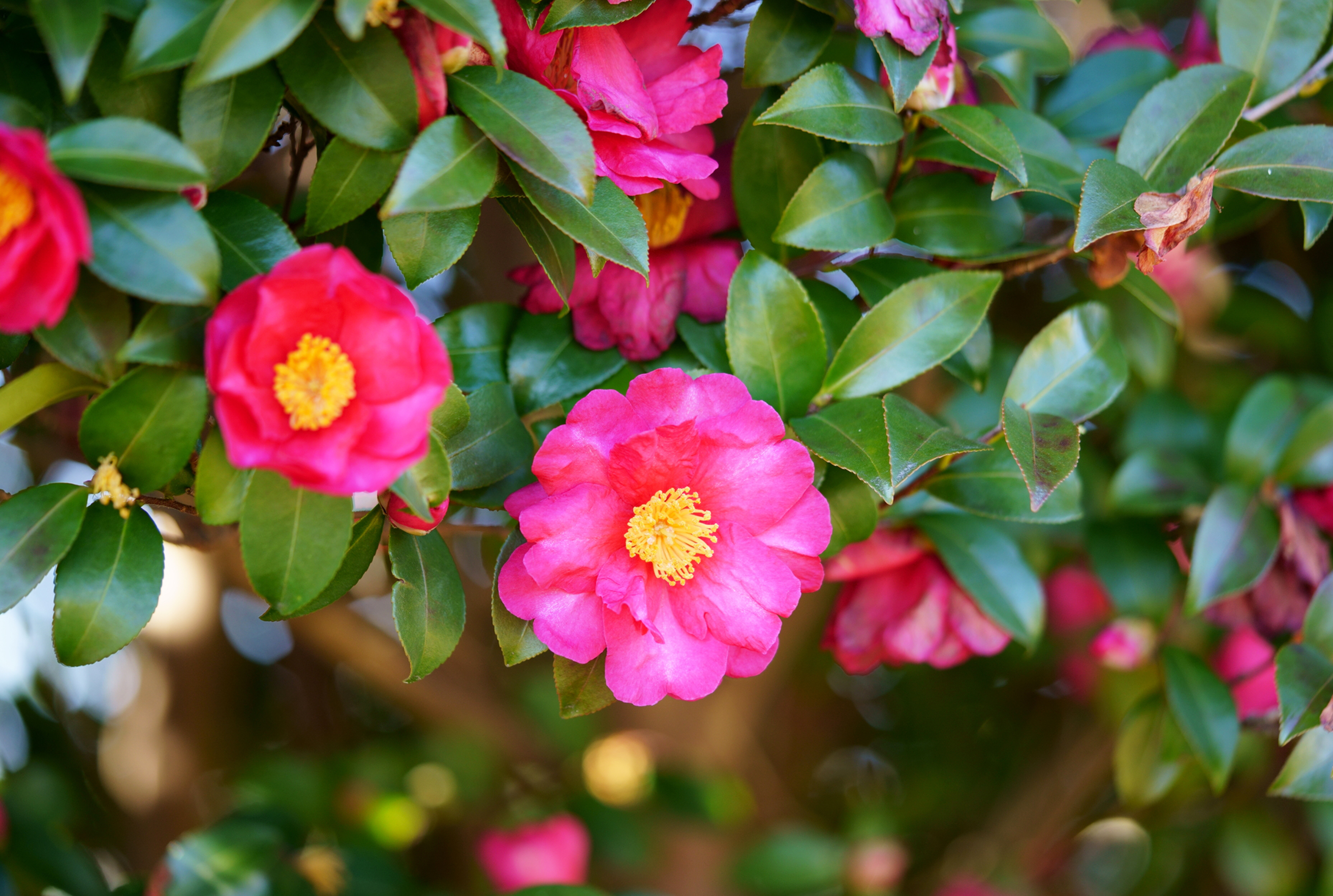 「さざんか さざんか 咲いた道」。童謡「たきび」の歌詞にあるように生垣に咲き、道を歩きながら見かけることが多いサザンカ。年を越すまで、次から次へと旺盛に咲き、冬の道を明るく灯してくれます。