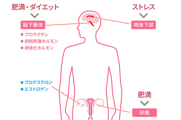 ダイエットだけでなく、太りすぎも月経不順や無月経を起こします。脂肪細胞が女性ホルモンのはたらきを妨げたり、ホルモンをつくる脳下垂体や卵巣のはたらきを弱めたりするためです。